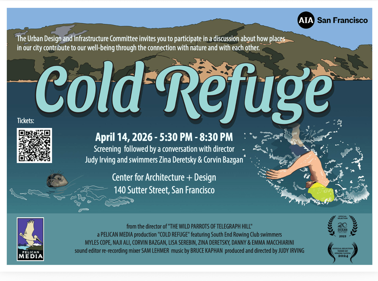 The AIASF Knowledge Community: Urban Design + Infrastructure Committee (UDIC) is pleased to present "Cold Refuge", a new documentary by Judy Irving (The Wild Parrots of Telegraph Hill). This film will kick-off a series of upcoming events centered around the theme of ‘Well-being in the City’ by the UDIC. We invite design professionals and the public at large to consider the value of designing public spaces that support well-being for our communities whether it be natural spaces to gather, play and recreate; event venues to celebrate and learn; or world class health services to thrive and heal. Future events include a Forest Bathing experience, a walking tour of Mission Bay, and more – highlighting the various amenities that San Francisco offers today and ideas for the future.