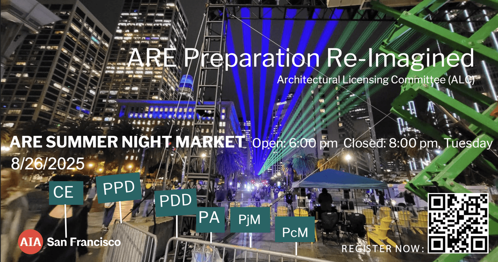 If you’re preparing for the Architectural Registration Examination (ARE), join us at the AIASF Summer Night Market at the Center for Architecture + Design for an evening of practice, guidance, and inspiration. Test your knowledge with live ARE quizzes and get direct advice and support from experienced ARE instructors.