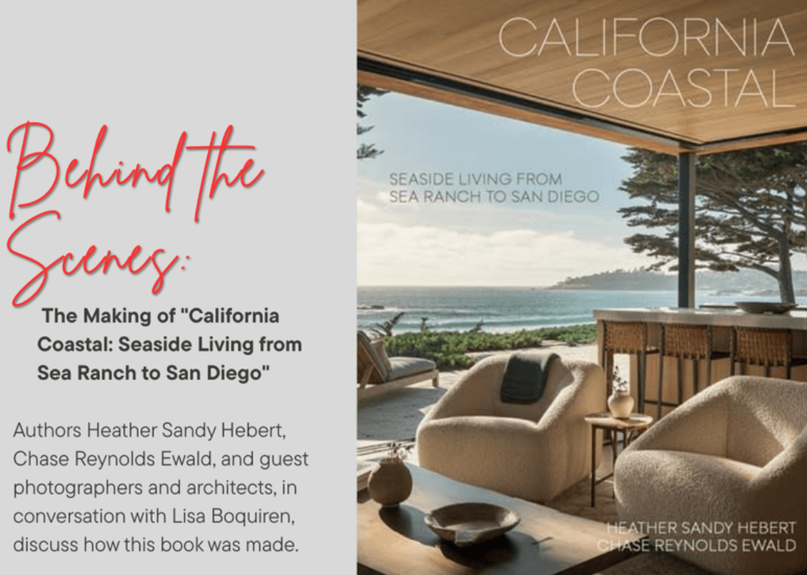 Armchair travel through select residences along the iconic landscapes of the California coast with authors Heather Sandy Hebert and Chase Reynolds Ewald, as they discuss their third book California Coastal: Seaside Living from Sea Ranch to San Diego, in conversation with Lisa Boquiren. Joined by several photographers whose work are featured in the book, the group will discuss what happens behind the scenes and how books like this come together.