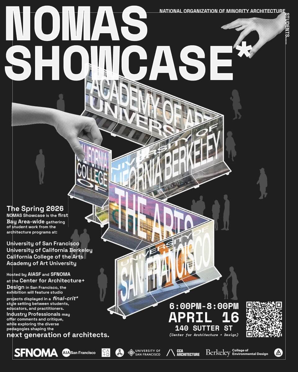 The Spring 2026 NOMAS Showcase is the first Bay Area-wide gathering of student work from the architecture programs at the University of San Francisco, University of California Berkeley, California College of the Arts, and Academy of Art University. Hosted by AIASF and SFNOMA at the Center for Architecture + Design in San Francisco, the exhibition will feature studio projects displayed in a final-crit style setting between students, educators, and practitioners. Industry professionals may offer comments and critique while exploring the diverse pedagogies shaping the next generation of architects.