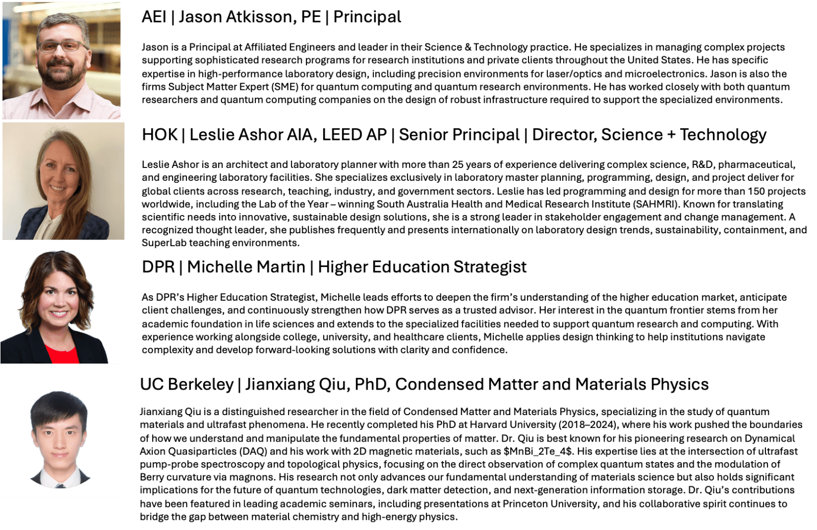 - Identify key planning, spatial design, and MEPS infrastructure considerations for quantum and AI specialized research and innovation environments.